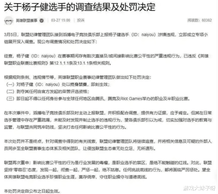 最终,LPL官方通知证明,naiyou存在屡次参与假赛的行径,这一论断无疑激励了更大限制的鼎新,四肢处理效用,他被处以内行限制终生禁赛,这意味着不仅无法再参与LPL赛事,致使连Riot Games及腾讯体系下的系数电竞赛事也全面封禁,不错说做事说念路透彻闭幕。