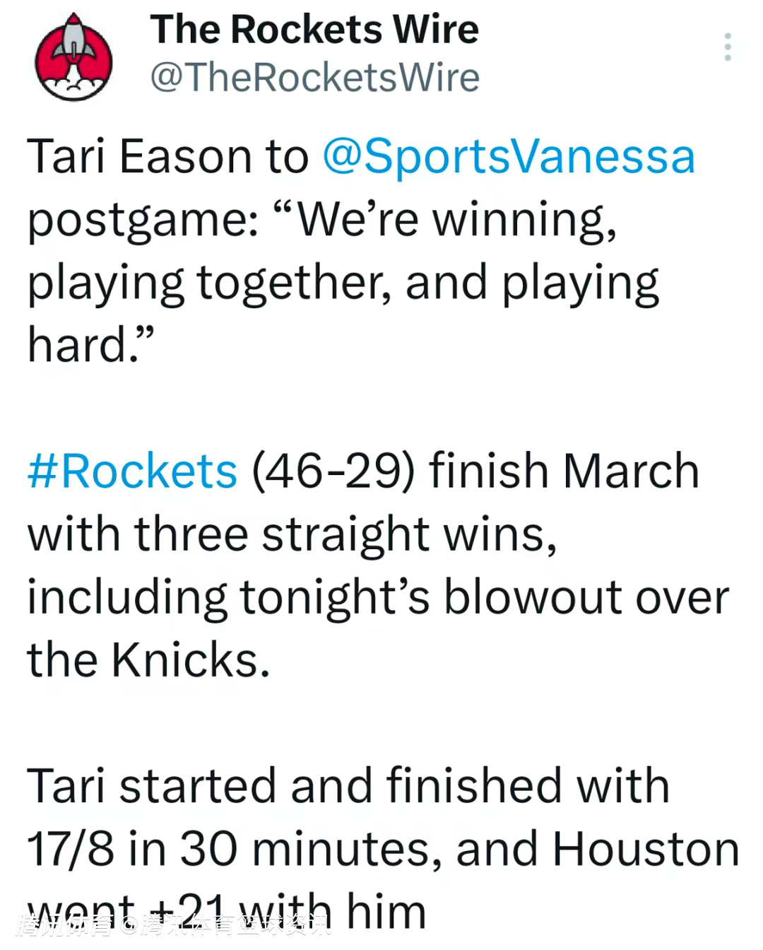 北京技艺4月1日,NBA成例赛持续进行,火箭以111-94轻取尼克斯,拿下本场告捷。本场比赛中,火箭球员伊森在缺席6场首发后从头回到先发声势,全场出战30分22秒,投篮10投6中,三分线外6投3中,罚球2罚全中,孝敬17分8篮板3助攻2抢断1盖帽的全面数据,OD体育(ODSports) 正负值高达+21。赛后,他经受媒体采访。