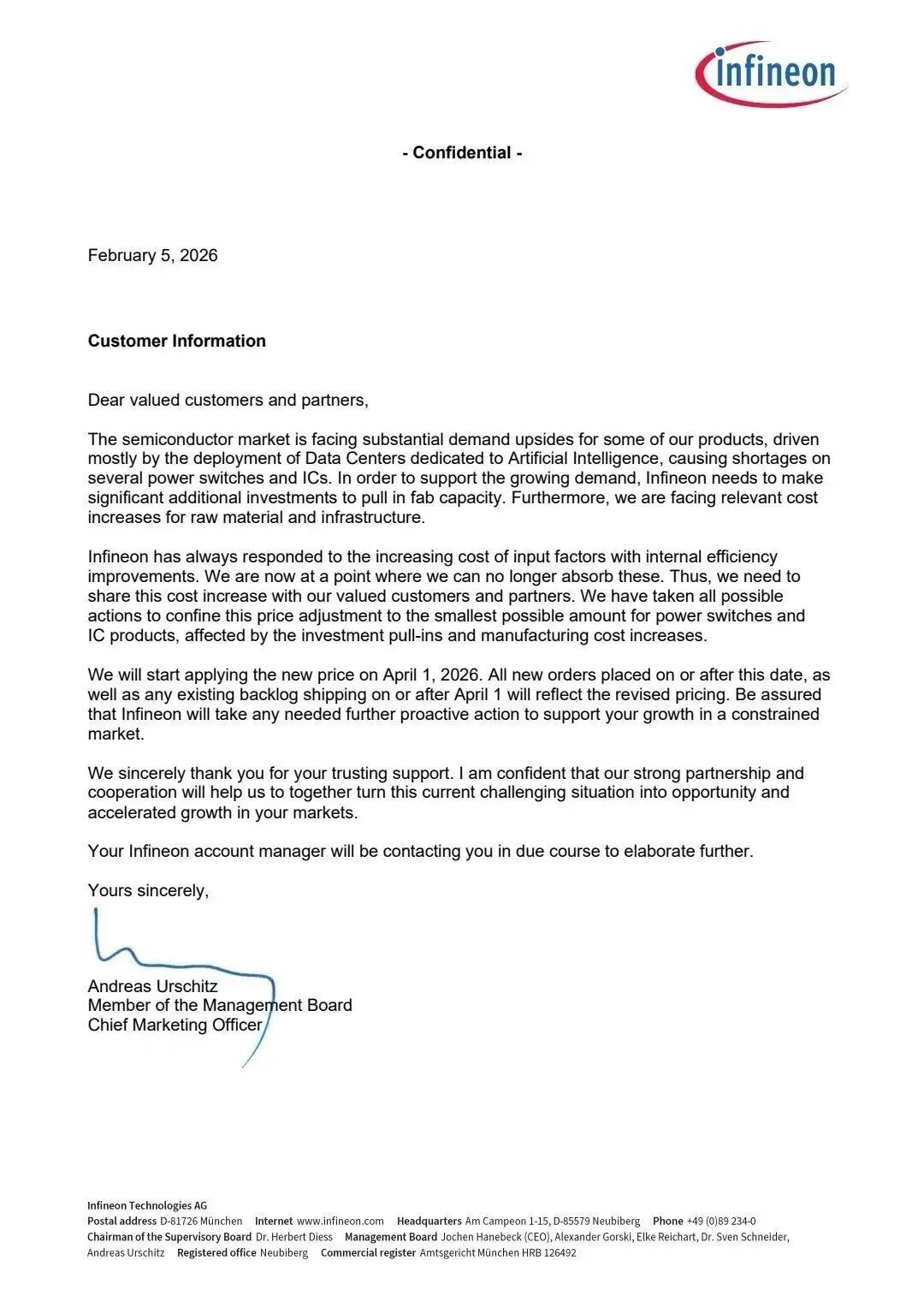 2月5日,各人功率半导体巨头英飞凌向客户发布调价函,晓示新价钱将于2026年4月1日起全面奏效。
