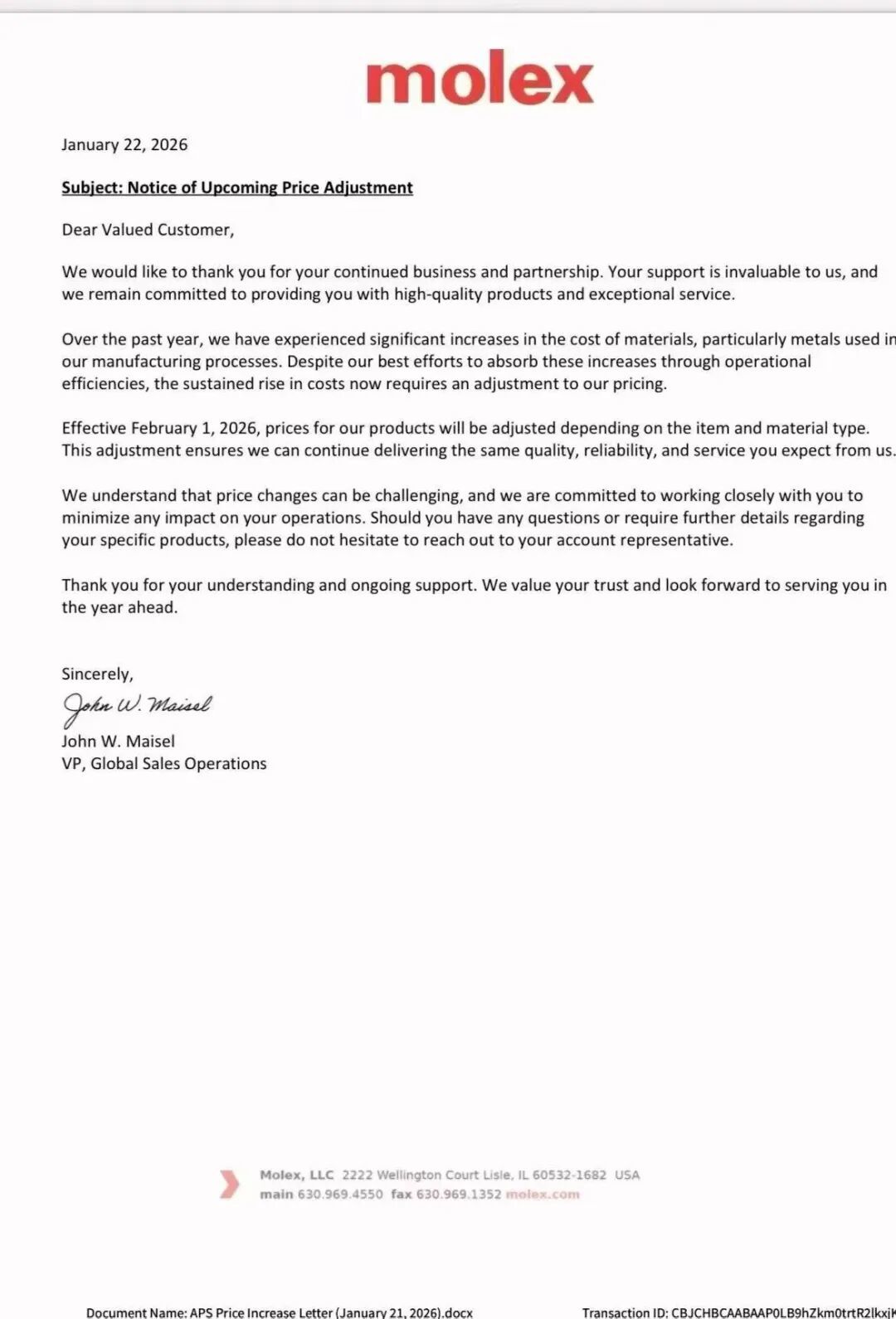 1月22日,Molex(莫仕)在2026年向其客户发布加价函默示,自2026年2月1日起,产物价钱将字据具体产物和材料类型进行调整。