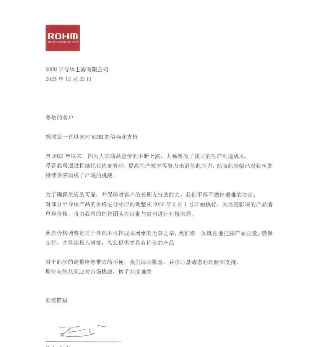 罗姆半导体上海有限公司发布陈述,3月1日起对部分半导体产物价钱实行调整。