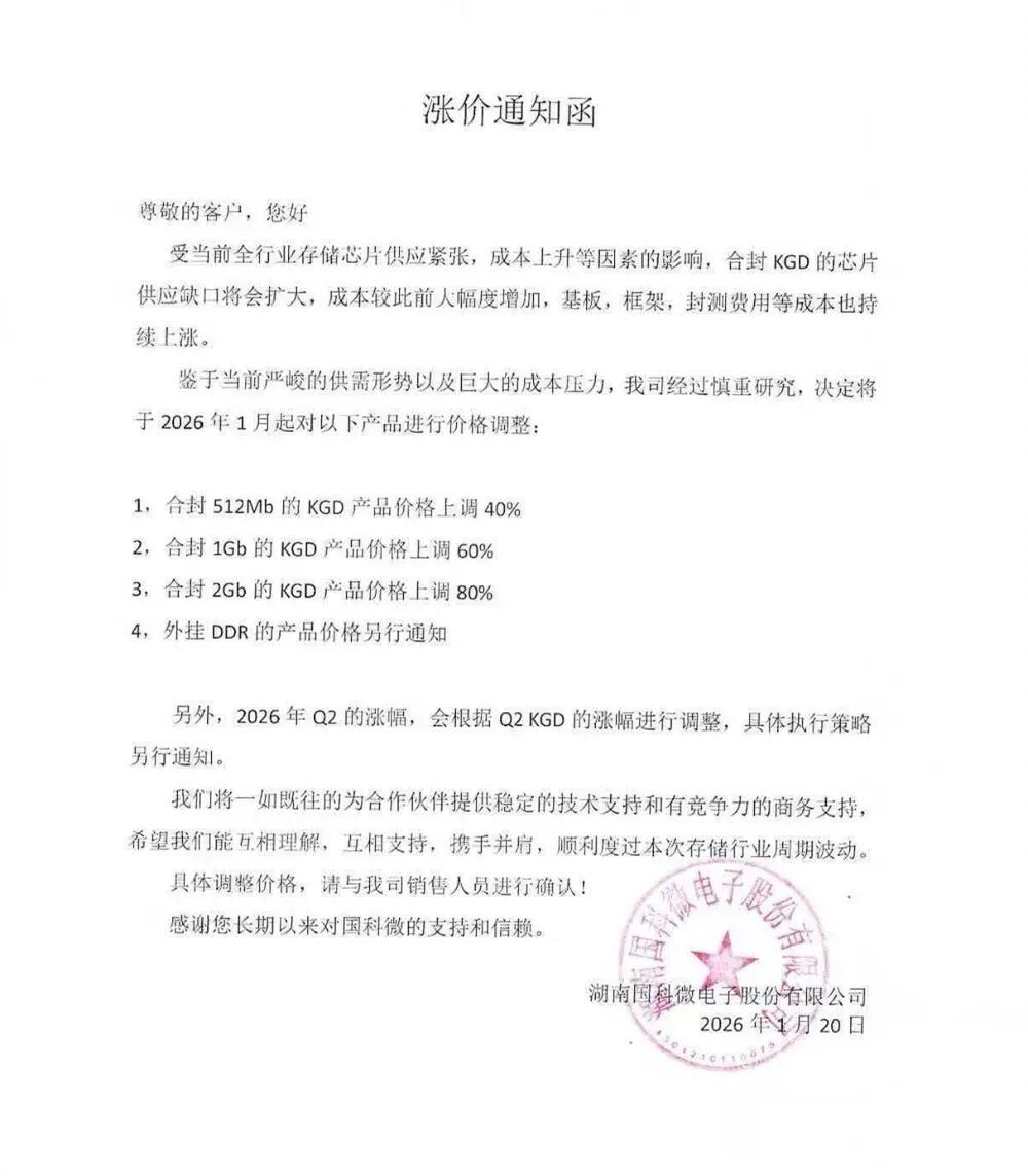1月20日,湖南国科微电子股份有限公司也对客户发出加价函,晓示自1月起对合封512Mb的KGD(已知及格芯片)产物加价40%,对合封1Gb的KGD产物加价60%,对合封2Gb的KGD加价80%,对外挂DDR的产物价钱另行陈述。