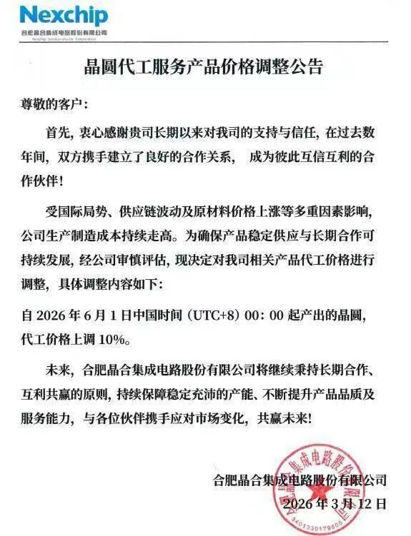 晶圆代工大厂晶书册成(Nexchip)于3月12日向客户发出“晶圆代工办事产物价钱调整公告”,晓示6月1日00:00起产出的晶圆加价10%。