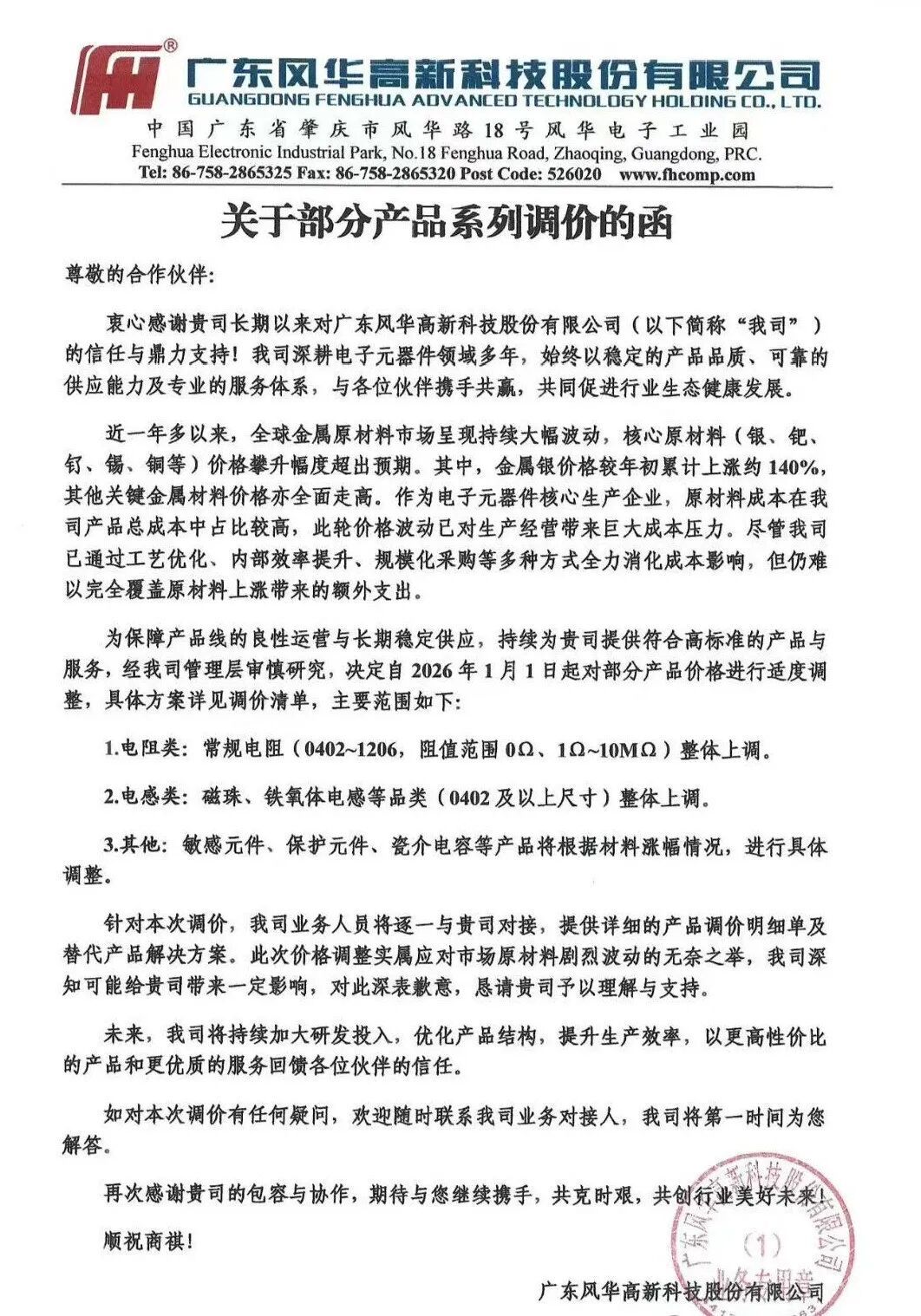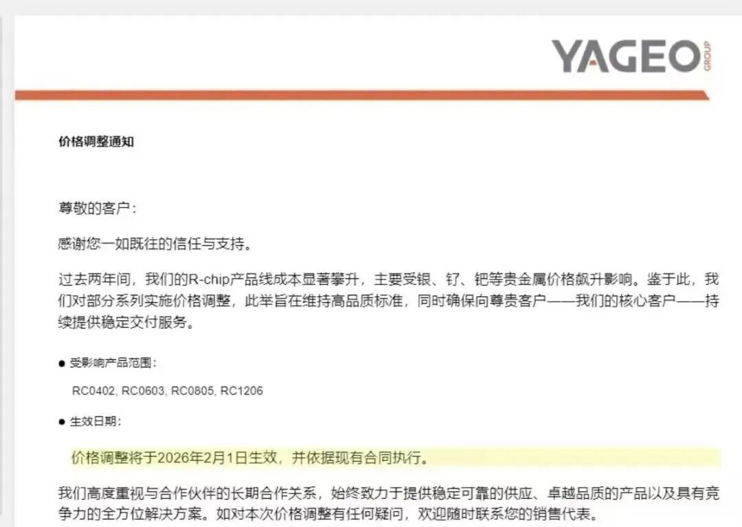 2025年12月27日,风华高科晓示,2026年1月1日起对部分产物价钱调涨。