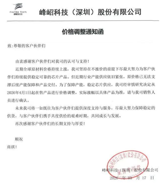 3月17日,峰岹科技发布加价函。陈述函自大,近期行业产能供应依旧垂危,原价钱已无法维持后续产能保险和产物托福,将从2026年4月1日起,在售产物进行价钱调整。