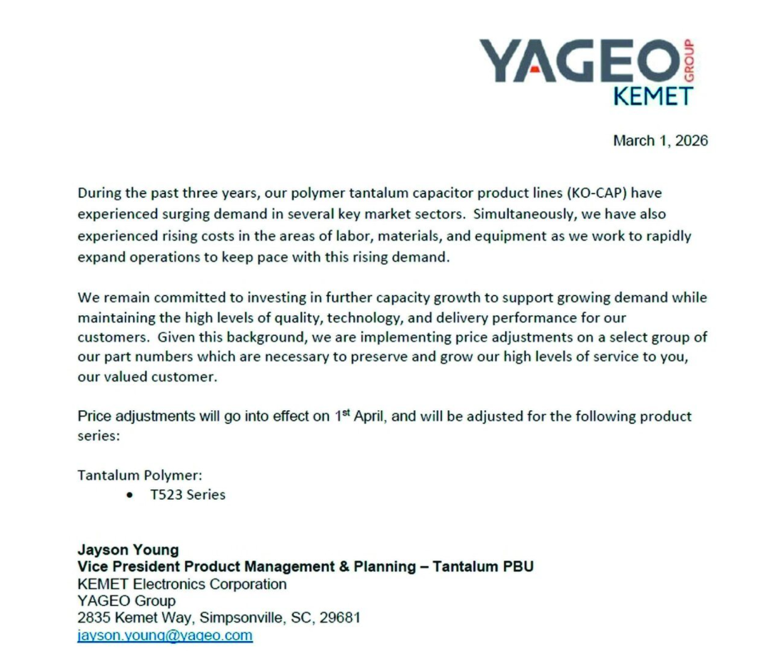 被迫元件大厂国巨旗下基好意思(KEMET)向客户发出加价陈述函,晓示对团聚钽电容产物线(KO-CAP)T523系列调加价钱。价钱调整将于4月1日奏效。