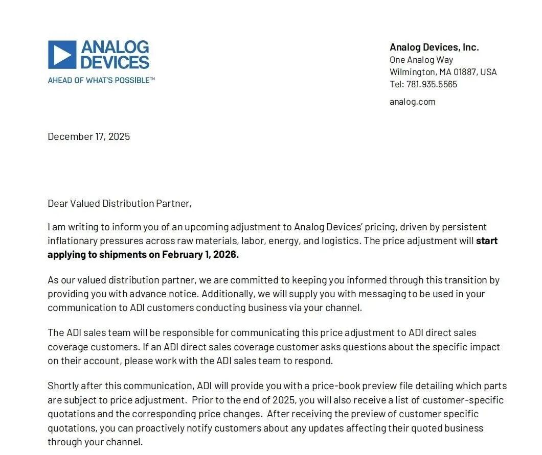 2025年12月17日,ADI发布的加价函:公司将调整产物价钱,价钱调整将从2026年2月1日起适用于所有这个词出货产物。该加价函虽未明确指出涨幅,但据渠说念清晰的进一步音讯,这次调价合座涨幅约15%,其中有近1000款军规级MPN产物涨幅达30%。