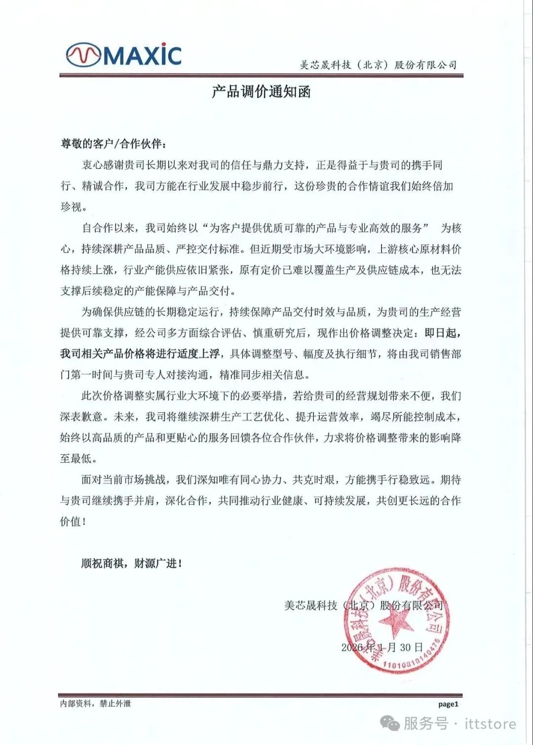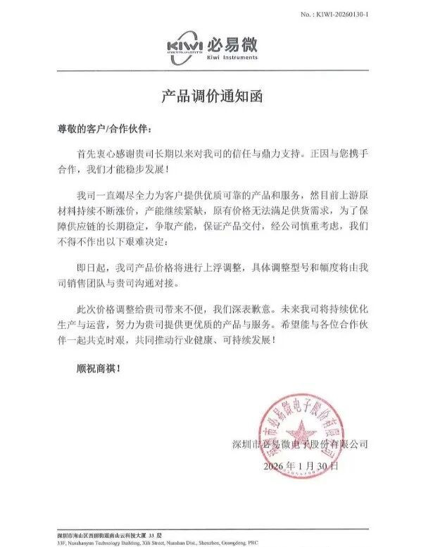 1月30日,好意思芯晟科技(北京)股份有限公司向客户发出“产物调价陈述函”,晓示即日起对干系产物价钱进行截至上调,具体调整型号、幅度及试验细节,将由公司销售部家世一时刻与贵司专东说念主对接同样,精确同步干系信息。