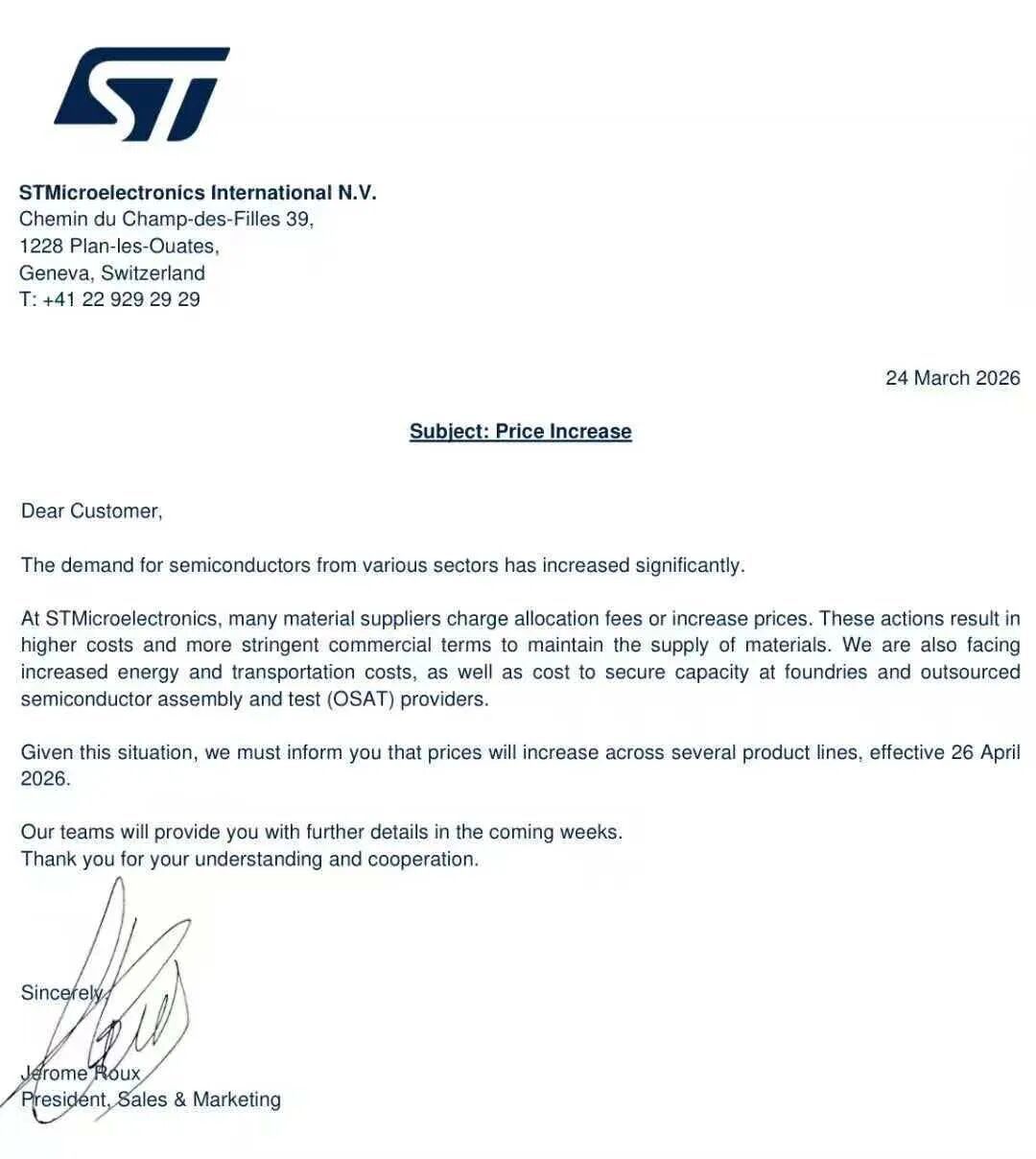 2026年,半导体行业的加价潮愈演愈烈,赶快席卷全产业链。 在AI激发的超等周期与上游金属资本高企的双重夹攻下,无论是存储芯片、MCU等中枢器件,如故晶圆代工、封测办事,乃至被迫元件与迷惑器,均密集开释出加价信号。 本文全面整理了2026年开年于今的行业加价信息,以供从业者快速把抓阛阓脉搏。 其中,4月1日将奏效的加价信息,触及峰岹科技、万国半导体(AOS)、安森好意思、恩智浦(NXP)、德州仪器(TI)、基好意思(KEMET)等企业。 以下为最新加价信息梳理: 3月24日,阛阓流传出意法半导体(ST)加价函,多款产物线的价钱将于2026年4月26日起上调。