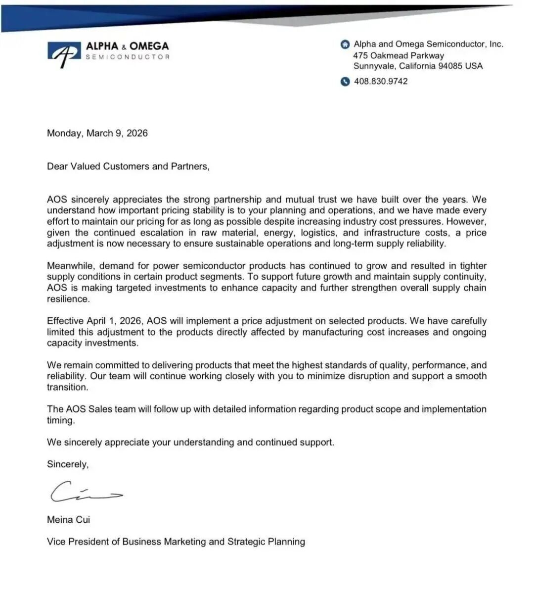 功率半导体厂商万国半导体Alpha and Omega Semiconductor(简称 AOS)于3月发布加价陈述,晓示自4月1日起对部分产物调价。