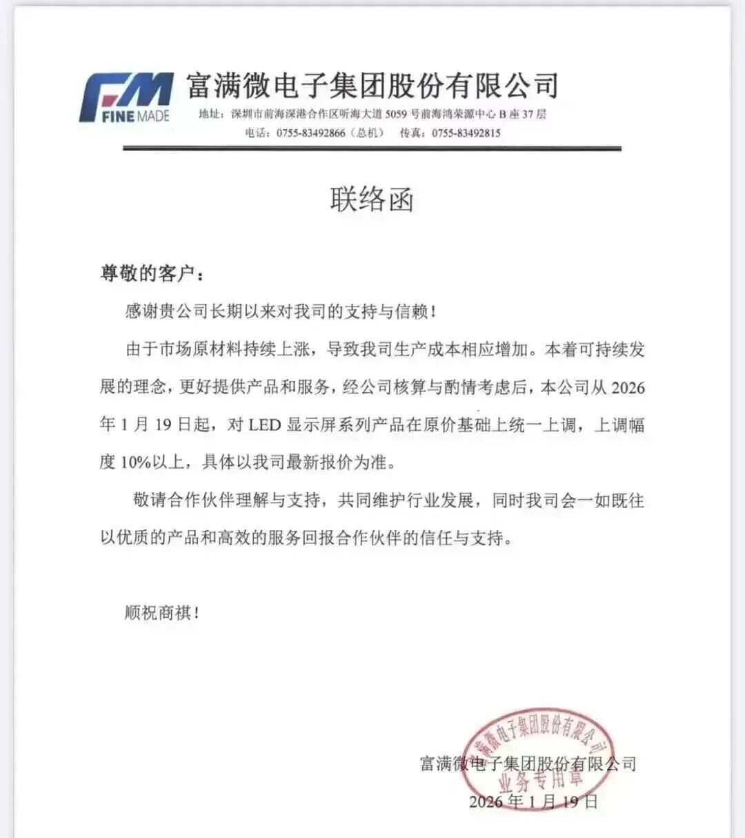 1月19日,富满微电子集团股份有限公司陈述,1月19日起对LED自大屏系列产物价钱上调,上调幅度10%以上。