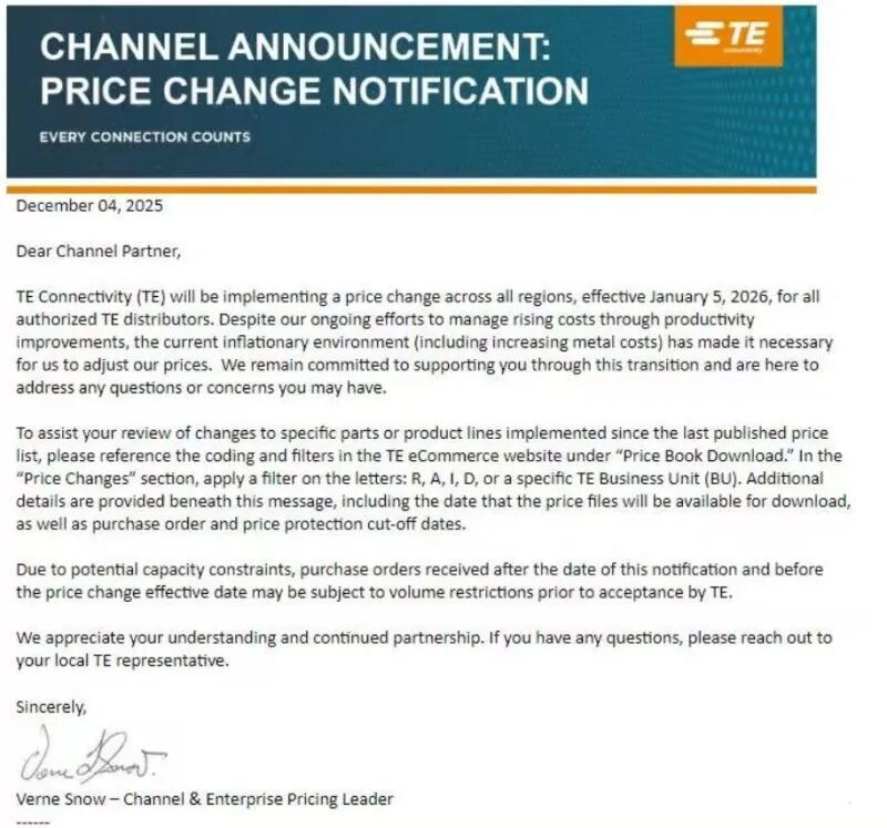 2025年12月4日,TE Connectivity发布加价陈述,计划自2026年1月5日起对全产物线、全区域实施价钱调整,部分品类的涨幅在5%-12%之间。TE于2026年2月3日再次发布加价函,晓示将于2026年3月2日起在各人所有这个词地区实施新一轮价钱调整。