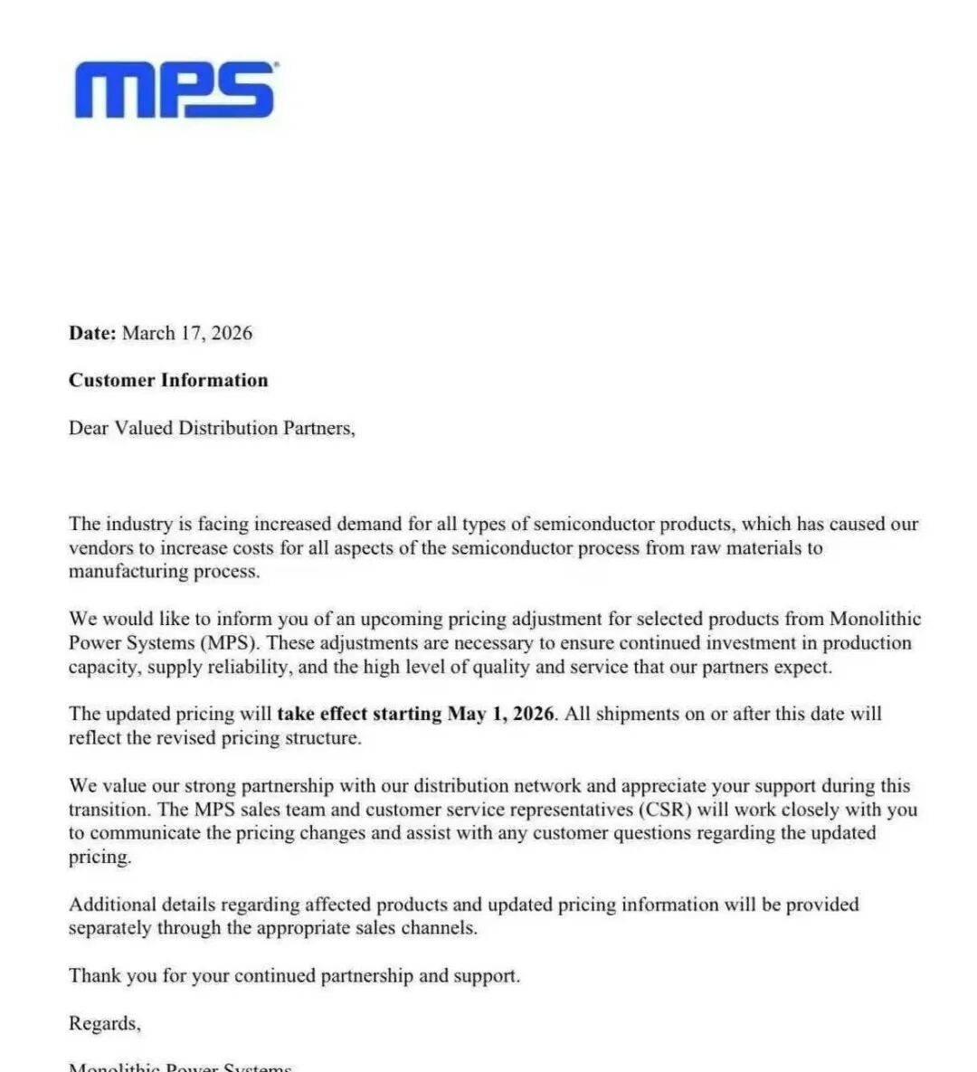 3月17日, MPS(芯源系统)发布加价函,将于2026年5月1日起对部分产物实施价钱调整。