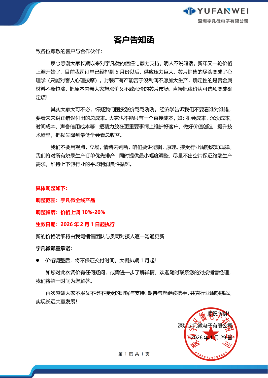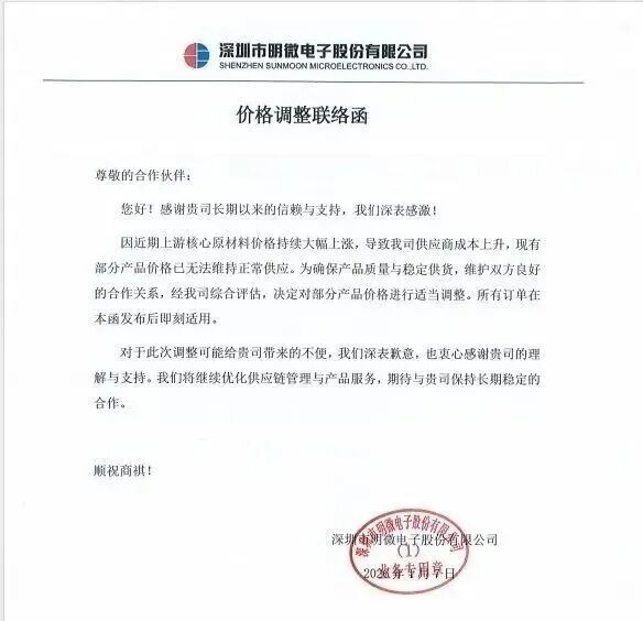 1月29日,深圳宇凡微电子有限公司发布“客户示知函”,晓示全线产物价钱上调10%-20%,自2026年2月1日起试验。