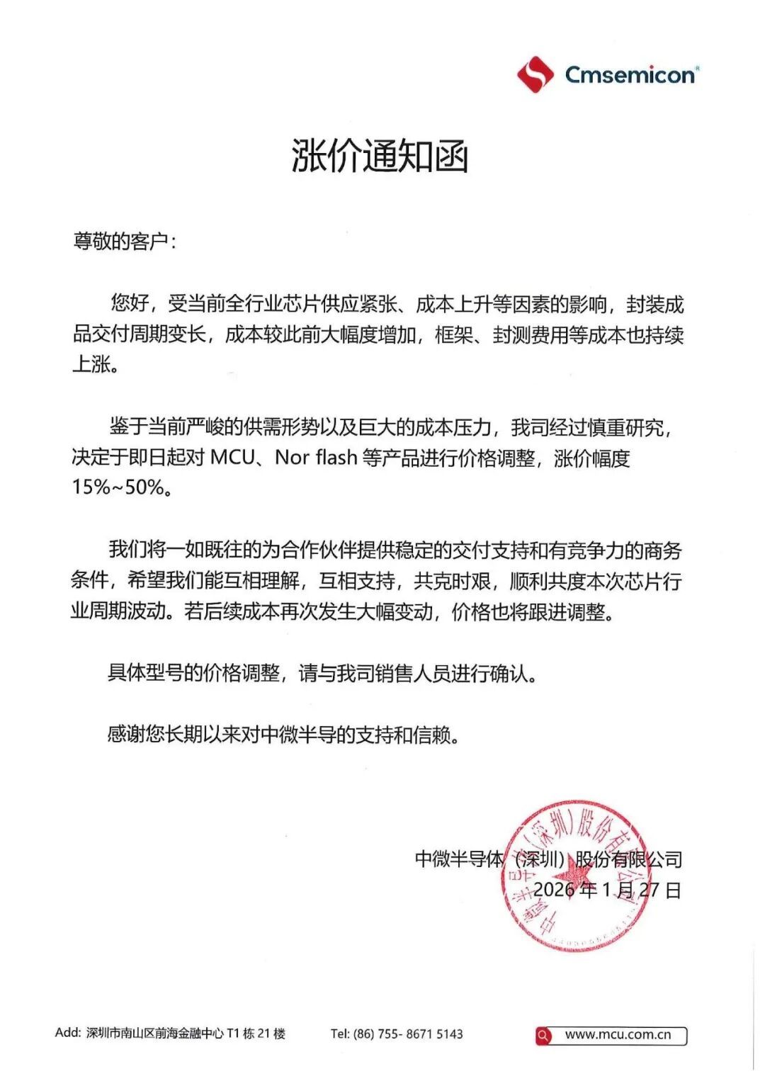 1月27日,中微半导体(深圳)股份有限公司发出加价函:决定于即日起对MCU、Nor flash等产物进行价钱调整,加价幅度15%~50%。