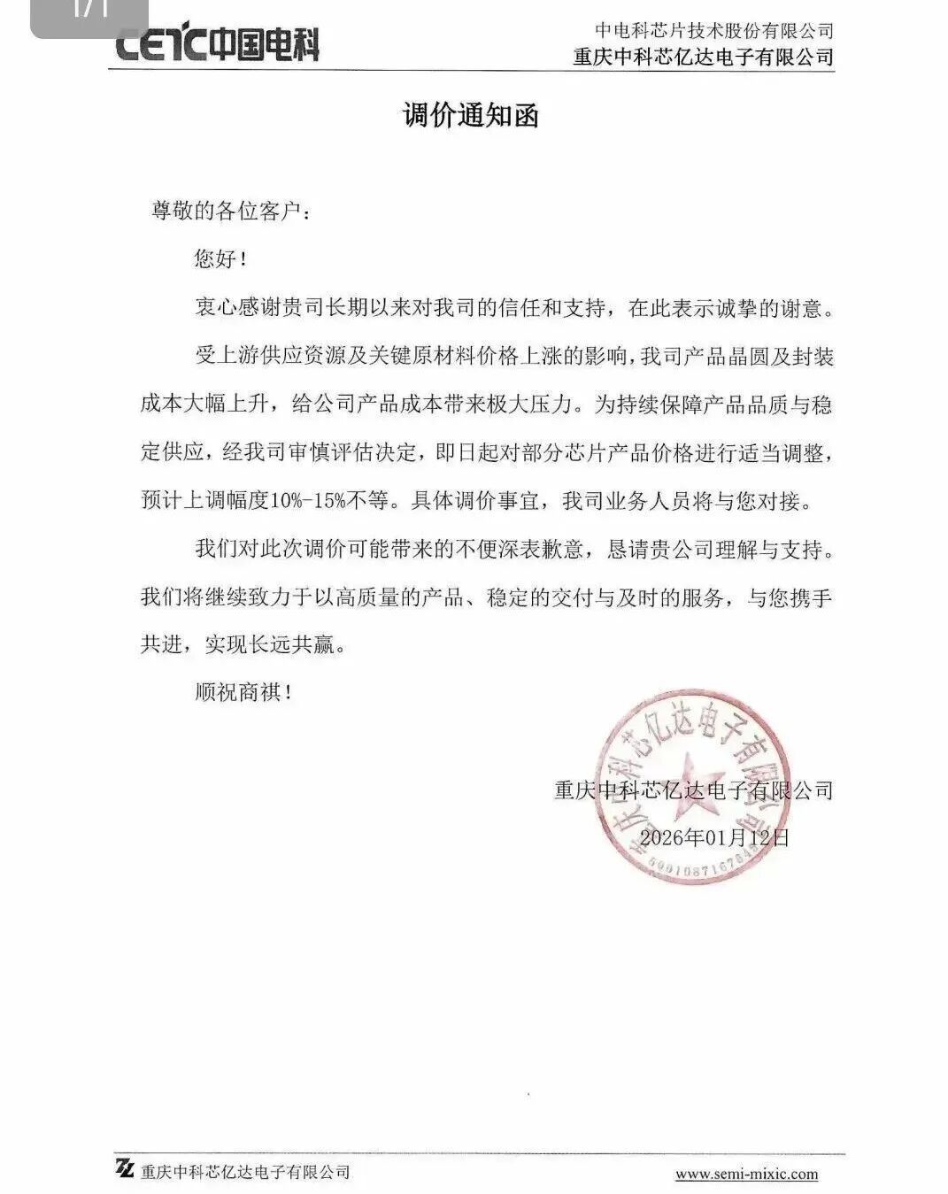 1月12日,重庆中科芯亿达电子有限公司晓示,即日起对部分芯片产物价钱调整,上调幅度10%-15%不等。