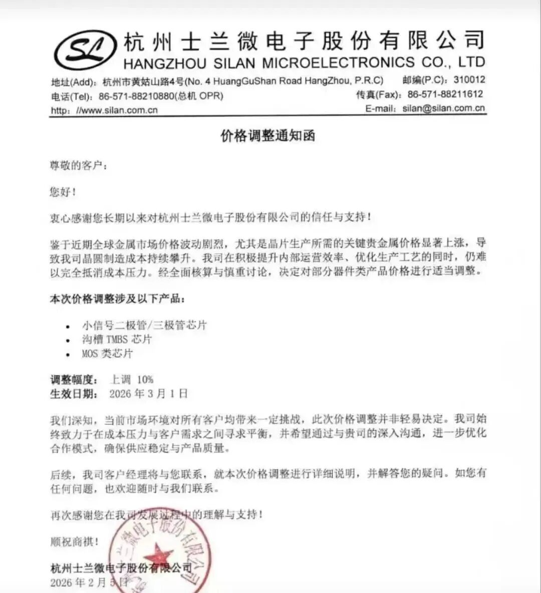 杭州士兰微电子股份有限公司发布价钱调整陈述函,晓示将对部分器件类产物价钱进行上调,调整幅度为10%,自2026年3月1日起崇拜奏效。本次价钱调整触及三类中枢产物:小信号二极管/三极管芯片、沟槽TMBS芯片、MOS类芯片。