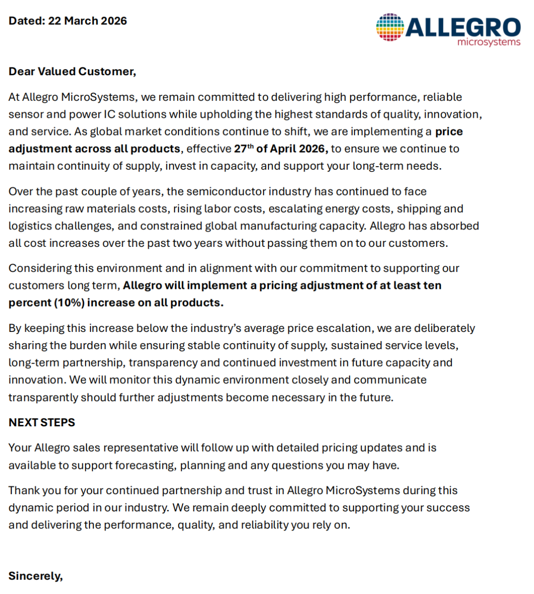3月23日,阛阓传出Allegro加价函。陈述自大,自2026年4月27日起,Allegro将对全线产物进行价钱调整,加价幅度至少10%。 Allegro MicroSystems 是一家各人当先的半导体公司,专注于传感器和电源集成电路(IC)。Allegro 产物是感知、调整和驱动机电系统的中枢功能。