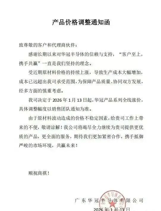 1月13日,广东华冠半导体有限公司晓示即日起全线加价。