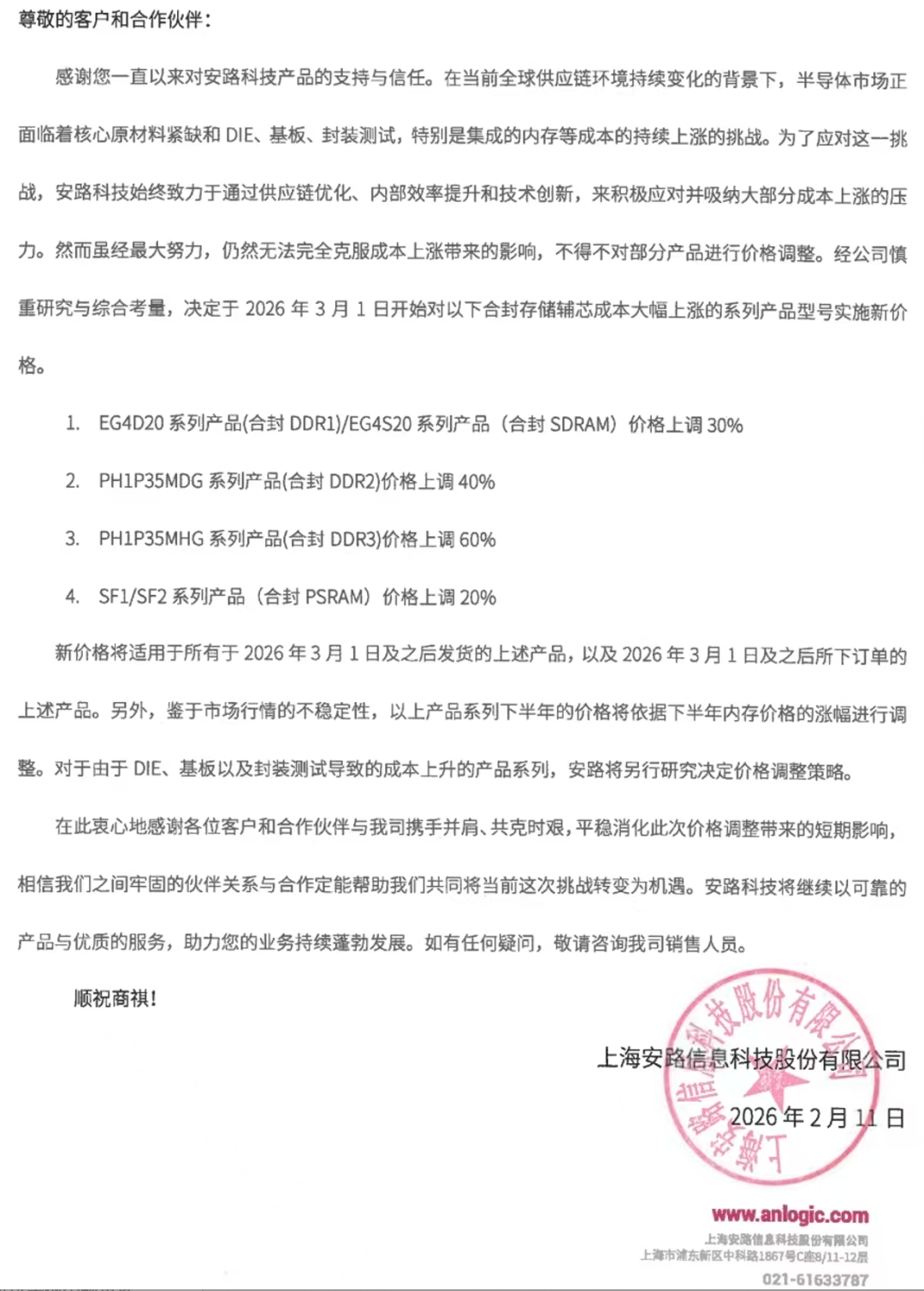 上海安路信息科技股份有限公司发布加价陈述,3月1日起将对合封存储辅芯资本大幅高涨的系列产物型号实施新价钱,价钱上调20%-60%。