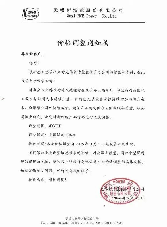 无锡新洁能股份有限公司发布加价函:公司将对MOSFET产物进行价钱上调,上调幅度10%起,本次价钱调整自2026年3月1日起发货崇拜奏效。