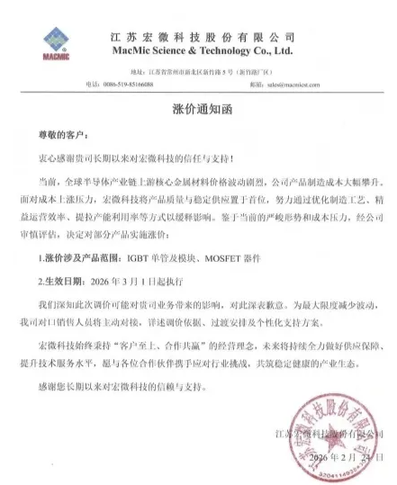 江苏宏微科技股份有限公司加价陈述函:将对IGBT单管及模块、MOSFET器件,2026年3月1日实施。