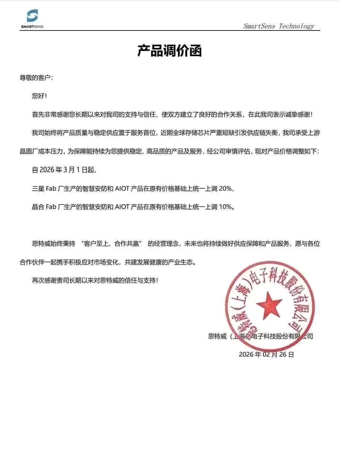 想特威向客户发出加价函,晓示自3月1日起,对在三星晶圆厂坐蓐的贤达安防和AIOT产物在原有价钱基础上长入上调20%;对在晶书册成晶圆厂坐蓐的贤达安防和AIOT产物在原有价钱基础上长入上调10%。
