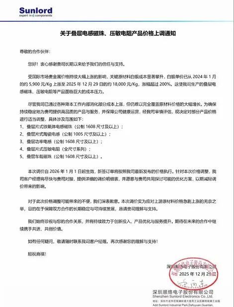 2025年12月29日,顺络电子发布加价陈述,默示将自2026年1月1日起对部分电感磁珠、陶瓷电感、功率电感、压敏电阻及车载磁珠产物进行价钱调整。