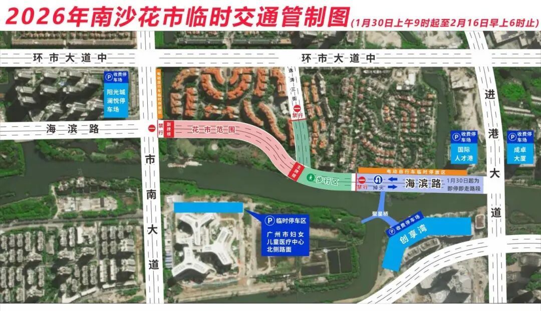 行花街,过大年! 2026年南沙区中心花市 将于2月10日开锣迎客 届时 南沙街说念部分路段 将实行临时交通料理 一都来望望吧~ 区中心花市左近 下周五起 实行临时交通料理 1月23日,南沙区花市办发布《广州市南沙区花市办对于2026年南沙区中心花市本事实行临时交通料理形状的秘书》称,为确保2026年南沙区中心花市奏凯举行,左证《中华东说念主民共和国说念路交通安全法》《广东省说念路交通安全条例》等研究规矩,决定对南沙街说念部分路段实行临时交通料理。 临时料理时刻:1月30日9时至2月16日6时; 临时料理路段:海滨路(市南大路路口至进港大路蕉门桥底)东西两边向实行临时交通料理。
