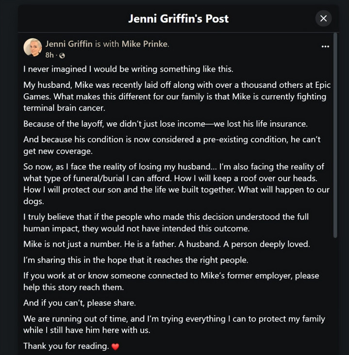 而就在这个时候,公司的一纸裁人示知,径直堵截了他的保障。 许多东说念主对“裁人”的相识,皇冠体育(CrownSports)其实停留在一个点:没责任了。 但在好意思国,这件事远远没那么简便。 责任,时常绑定着医疗保障。 保障,径直关系到你能不成活。 Mike被裁之后,家庭一刹参加“三连断”现象:收入没了、保障没了、改日的医疗保障也没了 更粗暴的小数在于他的病,被认定为“既往病史”,意味着他真的不可能再买到新的保障。 也等于说,OD体育(中国)这是一个真的无解的死局。 Mike的老婆,Jenni Griffin,在酬酢平台上写了一段话。 她说她当前每天皆在思几件事: 丈夫可能随时离开,我方能包袱得起若何的葬礼,若何奉侍孩子,若何保护这个家,以致连家里的狗改日若何办。