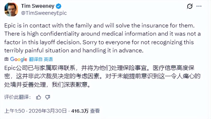 这些问题同期压在一个东说念主身上的。 然后她写了一句让多数东说念主千里默的话:“Mike不仅仅一个数字,他是一个父亲,一个丈夫,一个被趣味的东说念主。” Jenni还提到一个要津点:Mike为了诊治,常常请假、频繁就医。 而况还使用过公司的带薪病假,也等于说公司粗略率是知说念他的病情的。 这件事在收集上速即传播之后,终于传到了Tim Sweeney的耳中。