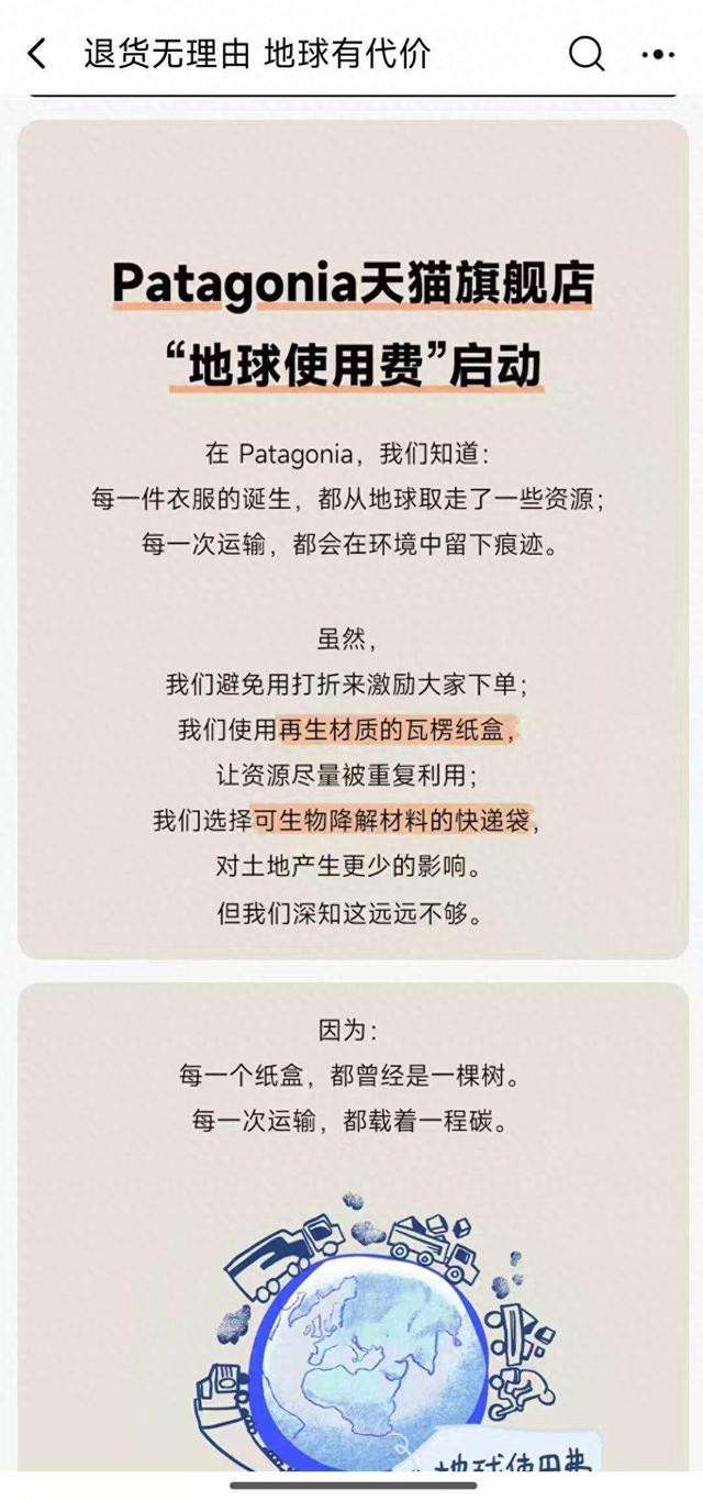 巴塔哥尼亚“地球使用费”行径页面 该品牌在行径页面称,巴塔哥尼亚行为户外服装品牌,在2025年双11本领,退货率高达69.7%,2023-2025年巴塔哥尼亚天猫旗舰店因发货产生了190.36吨碳排放,退货而产生的快递产生了40.9吨碳排放……是以,咱们作念了一个决定,本年4月“地球月”,巴塔哥尼亚天猫旗舰店将试验“地球使用费”计谋。它不是刑事职守,而是一次邀请,请全球一皆来为减少网购对环境的影响而步履。 该品牌还提到,这不是一张冷飕飕的运脚休养见告,而是邀请花消者点击“购买”前请三想,OD体育(ODSports) 点击“退货”前也请三想。 在应酬媒体上,大部分网友对此都捏质疑格调,“地球情愿了吗?就替它收费”“论若何把额外用度描画得魁伟上”。不外也有网友对其环保理念暗示赞同。