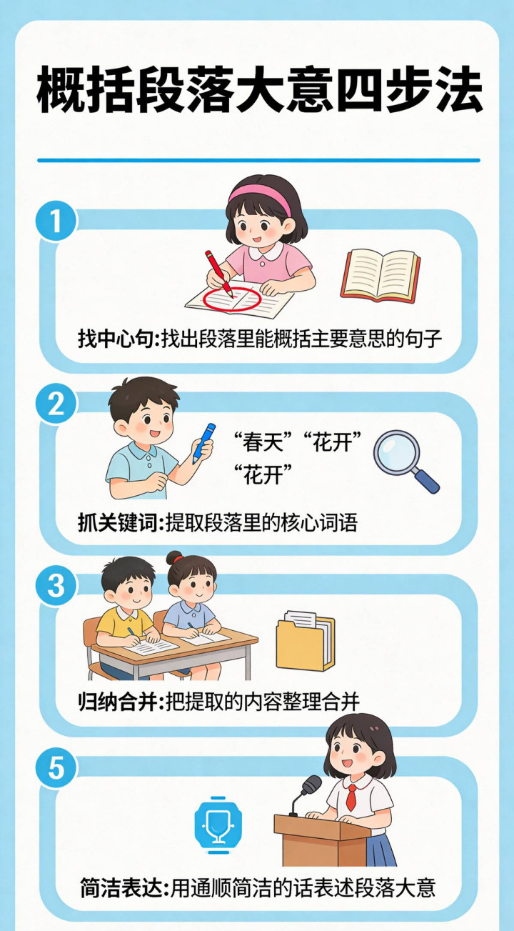 一线老师整理 · 可平直打印使用 · 家长必备 模块:阅读意会 一、概述 概述段落卤莽是小学语文阅读意会的贫困才气。许多孩子靠近一段笔墨不知怎样提真金不怕火中心,要么照抄原文,要么偏离重心。本尊府先容"四步法",通过概况易行的要津,匡助孩子快速准确概述段落卤莽。