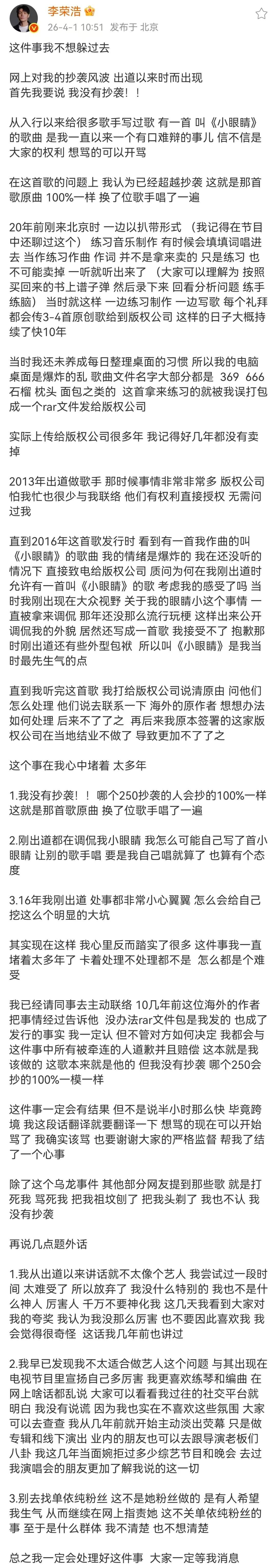 因公开喊话单依纯侵权演唱歌曲《李白》而受到时常和顺的李荣浩,近日堕入“抄袭”风云。 近日,有多位网友在酬酢媒体上发文指控李荣浩崇拜作曲的歌曲《小眼睛》涉嫌抄袭日本歌手平井坚的《Signal》。有乐评东谈主称,《小眼睛》的旋律、和声、段落结构与平井坚2003年的作品《Signal》高度重合,并称其“抄袭”。此外,也有网友质疑,李荣浩其他作品如《两个东谈主》《太率直》疑似师法好意思国歌手John Mayer的作品《St. Patrick's Day》、《Vultures》。 4月1日中午,李荣浩通过酬酢平台发布长文薪金“抄袭”一事。李荣浩暗示,《小眼睛》的发布是一场“乌龙”。李荣浩说,“哪个250抄袭的东谈主会抄的100%相同,皇冠体育(CrownSports)这便是那首歌原曲,换了位歌手唱了一遍。” 李荣浩解说谈,出谈之初会以扒带形式老到音乐制作,并不是拿来卖的。《小眼睛》看成一首拿来老到的曲子被误打包成一个文献发给版权公司,od体育中国手机官网入口随后版权公司在未斟酌其观念的情况下把歌曲刊行。 李荣浩暗示,“我依然请共事去主动勾通10几年前这位国外的作家,把事情过程告诉他。没目标rar文献包是我发的,也成了刊行的事实,我一定认。但岂论对方怎样决定,我皆会与这件事中总共被连累的东谈主谈歉况兼补偿,这本便是我该作念的,这歌正本便是他的。但我莫得抄袭,哪个250会抄的100%一模相同。” 李荣浩还提到,“除了这个乌龙事件,其他部分网友提到那些歌,便是打死我、骂死我、把我祖坟刨了、把我头剃了,我也不认,我莫得抄袭。”