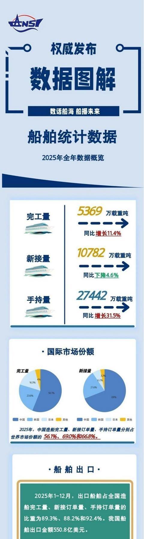 你可能想不到,2025年中国造船业的"第二把交椅",既不是上海,也不是浙江,而是辽宁。 更让东说念主想不到的是,帮辽宁拿下这个位次的最大元勋,是一家三年前才配置的民营企业。这家企业一年签下115艘新船订单,金额冲破1000亿元,接单量排到了民众第一。它叫恒力重工,坐落在大连长兴岛上。 2026年头,中国船舶工业行业协会发布了《2025年船舶工业经济运转分析》。 数据很硬:2025年,我国造船完工量5369万载重吨,同比增长11.4%,占民众总量的56.1%;新接订单量10782万载重吨,占民众69%;手抓订单量27442万载重吨,同比增长31.5%,占民众66.8%。三大目的荟萃16年保抓世界第一。 韩国完工量占比23.6%,日本16.3%。差距有多大?我国一家的份额,比韩日加起来还多。民众18种主要船型里,我国有16种新接订单量拿下了世界第一。散货船、货滚船的国外份额逾越80%,集装箱船、化学品船逾越70%。这组数据,放在十年前根底不敢想。