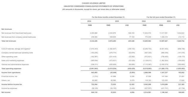 霸王茶姬(NASDAQ:CHA)昨日公布2025年第四季度及全年功绩数据。财报炫耀,霸王茶姬2025年总GMV达315.8亿元,营收为129.1亿元(约18.46亿好意思元),较上年同期的124亿元增长4.1%,净利为11.35亿元(约1.62亿好意思元),经休养净利润为19.1亿元。