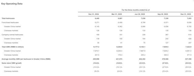 霸王茶姬2025年第四季度营收为29.75亿元(约4.25亿好意思元),较上年同期的33.34亿元着落11%。 霸王茶姬2025年第四季度加盟店的净收入为24.349亿元(约3.482亿好意思元),与2024年同期的30.959亿元比较有所着落。这主如若由于各时分新家具的推出时机和节律不同,以及中国在线外卖平台补贴竞争态势的变化所致。2025年第四季度,加盟店的净收入占公司总净收入的81.9%。 霸王茶姬2025年第四季度直营店的净收入为5.396亿元(约7720万好意思元),较2024年同期的2.386亿元增长126.2%。增长的主要原因是公司国内茶室组成的滚动以及直营店在国际市集上的握续推广。2025年第四季度,直营店的净收入占公司总净收入的18.1%。 霸王茶姬Q4老本与用度30.1亿 同比增12%