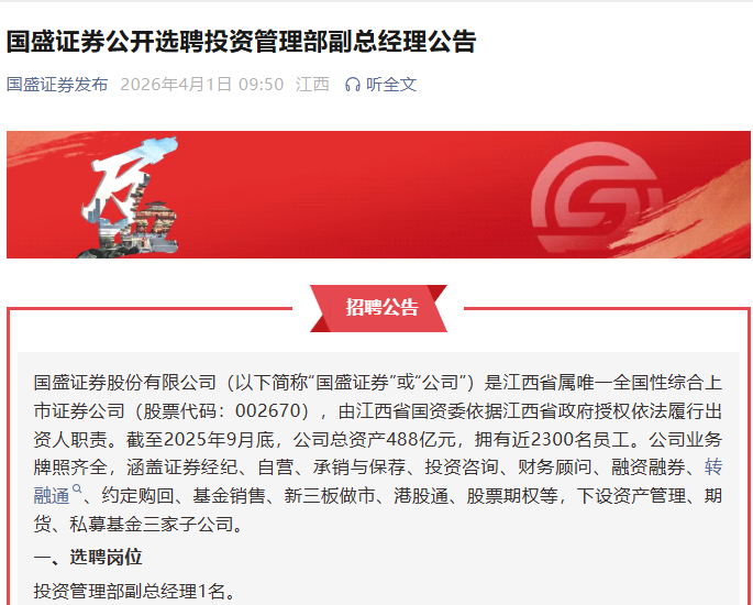 全体来看,完成股权更替后,看成江西省属独一寰宇性详尽上市券商,国盛证券的市集化选聘照实动还是很眩惑温存,尤其是近一年,密集招聘总司理、业务线负责东说念主及子公司高管,类似现存高管东说念主员交流,公司正迎来一轮系统性的管制层焕新与东说念主才升级。 凭证公告,国盛证券这次选聘的两位副总司理将承担公司要紧的野心管制职责。这是继旧年以来国盛证券在高层管制团队建设上的又一要紧举措。值得注意的是,这次选聘背后,是公司现存两位高管行将下野的推行需求。 两位高管行将离任,新一轮聘用动手 选聘公告闪现,国盛证券这次选聘的2名副总司理,中枢职责涵盖参与公司野心管制决策、制定并落地摊派领域野心决议、统筹摊派业务合规与风险戒指,以及履行法律执法、公司限定赋予的其他职责。